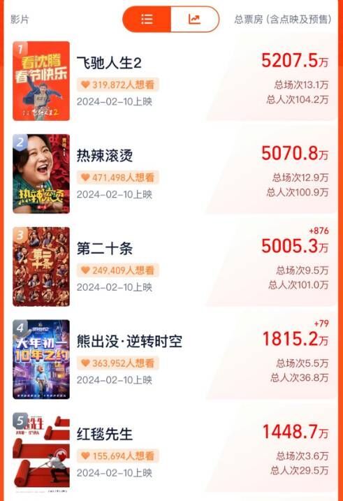 据灯塔专业版,2024春节档新片预售总票房已突破2亿元。《热辣滚烫》(贾玲导演)《飞驰人生2》(韩寒导演)《第二十条》(张艺谋导演)暂列春节档新片预售票房前三位,且预售票房均突破5000万元。三部电影间的预售票房较为胶着,未拉开差距。原因或是2024年春节档没有大投资的巨制,《热辣滚烫》《飞驰人生2》《第二十条》《红毯先生》等电影以喜剧、励志主题为主。